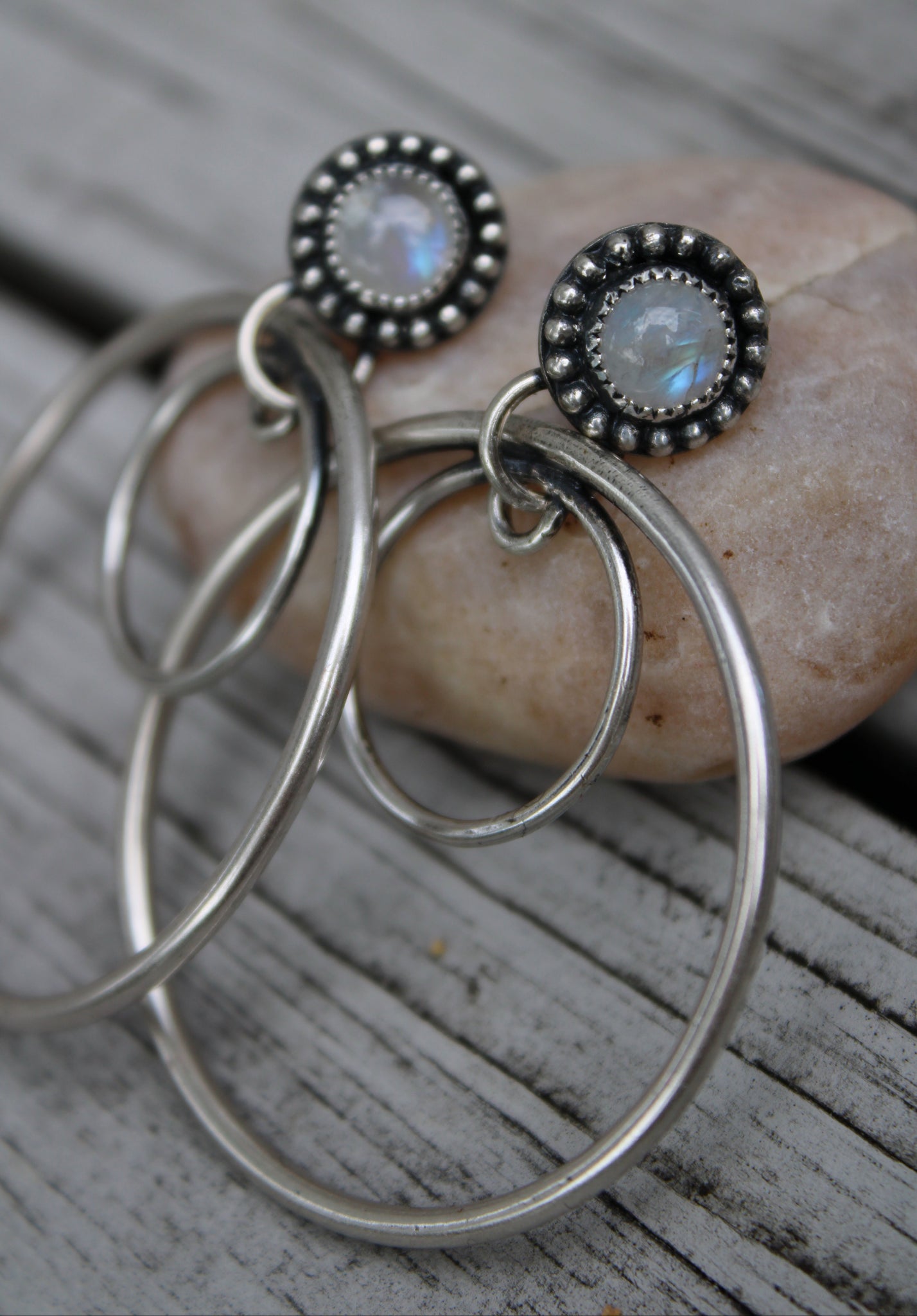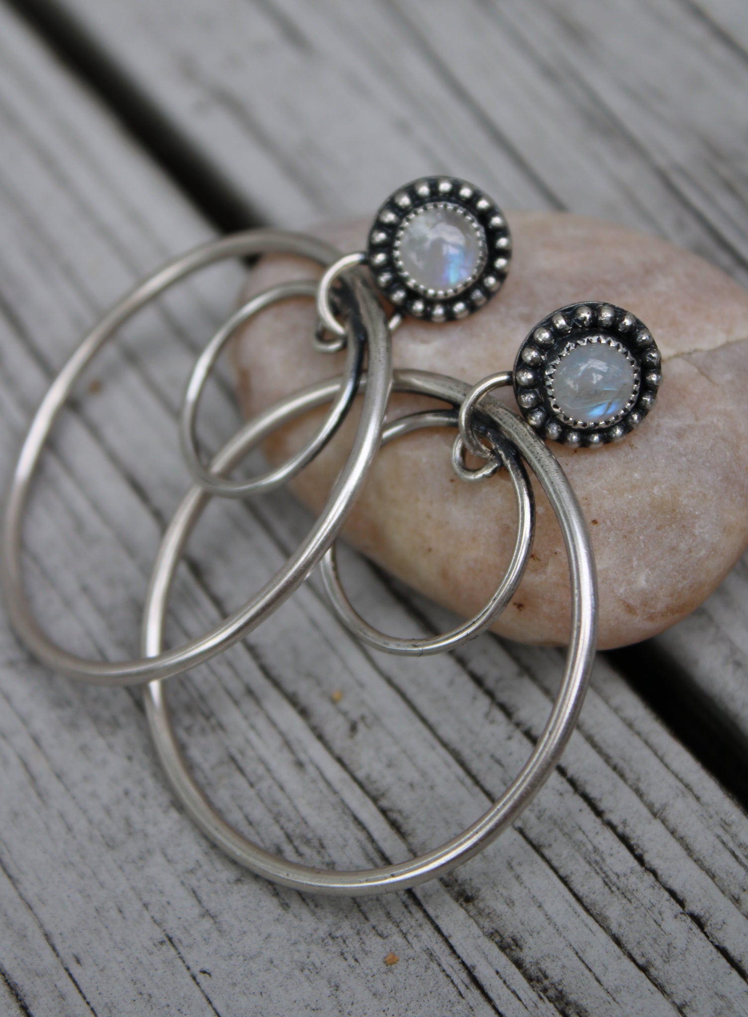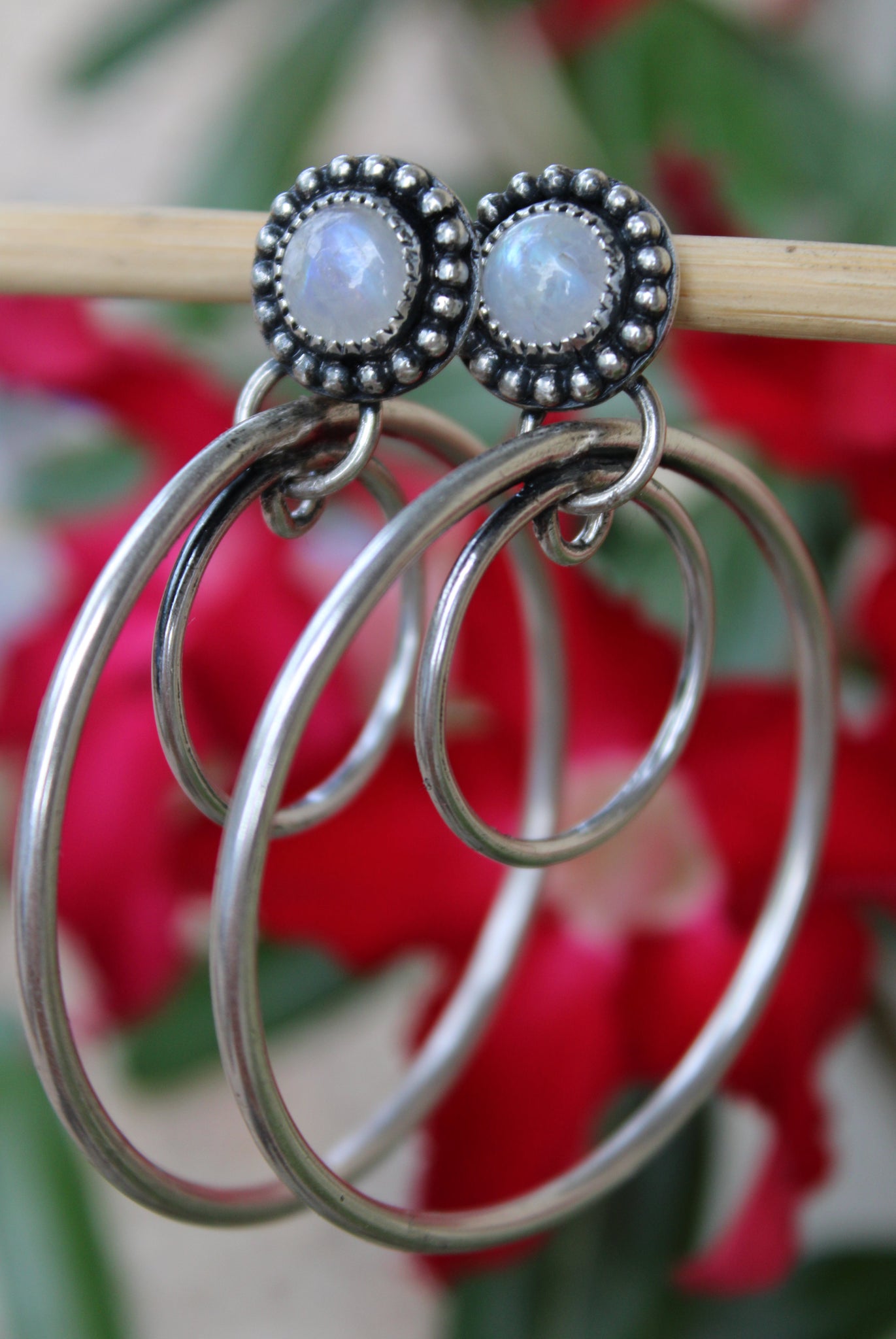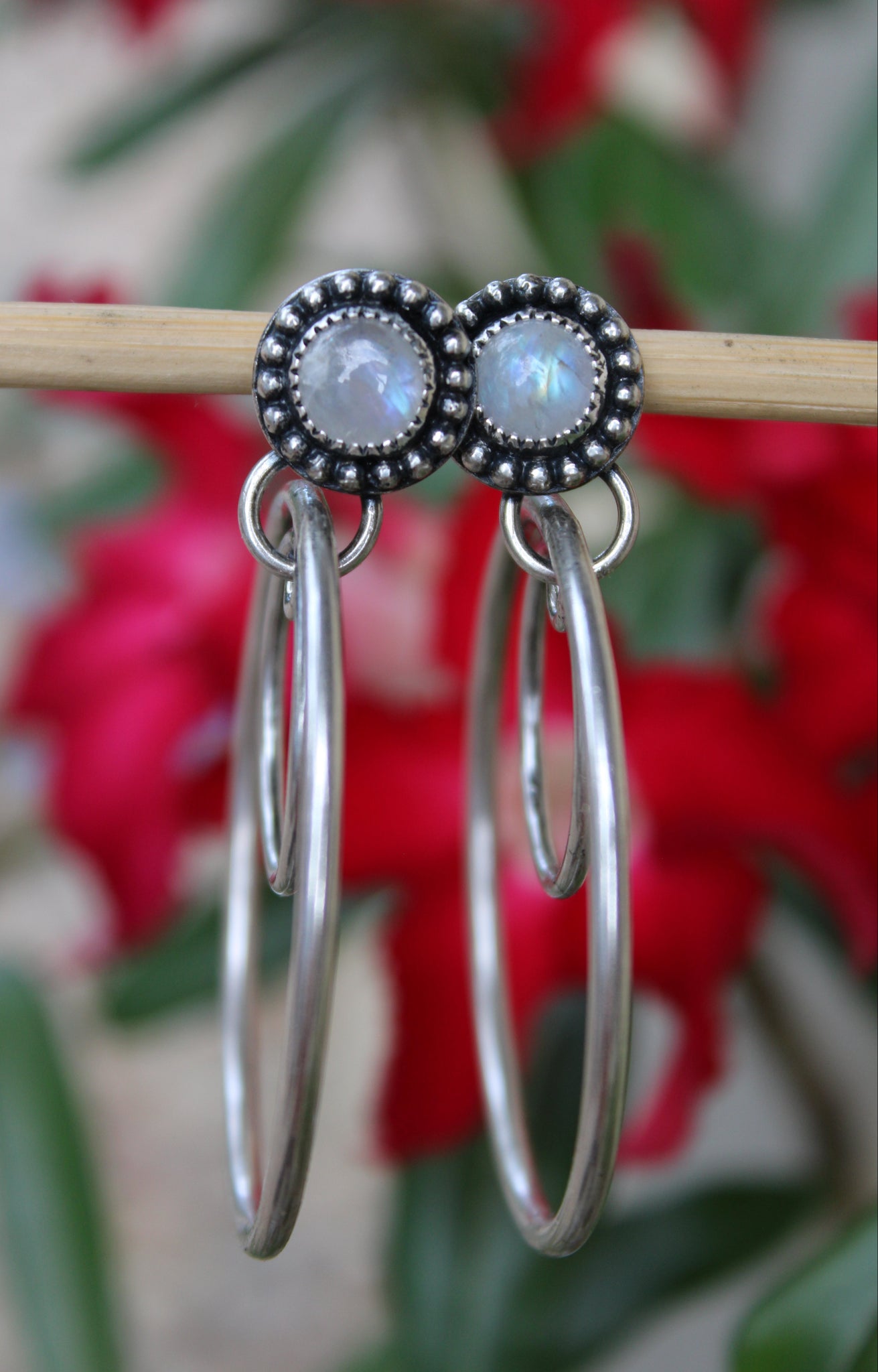 Feel the power of that inner glow with these stunning hoops! Two flashy round Moonstone cabs are the center attraction to these double hoop earrings. The stones are set in serrated bezels and framed with beaded wire. A sturdy 19 gauge stud sits on the back and below hangs a sturdy double hoop measuring 2" across. These babies make a big statement, measuring at 2 1/2" long from end to end.
