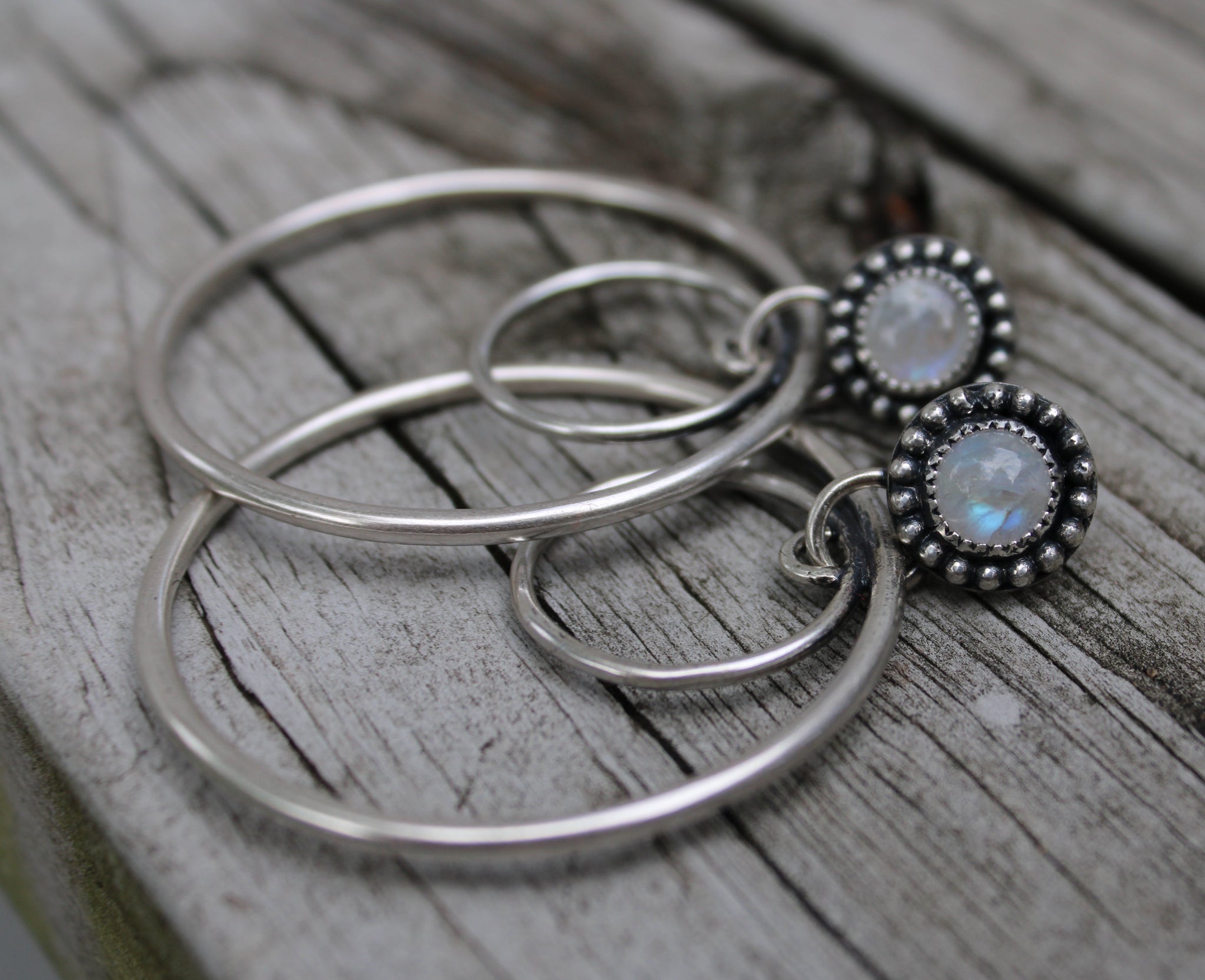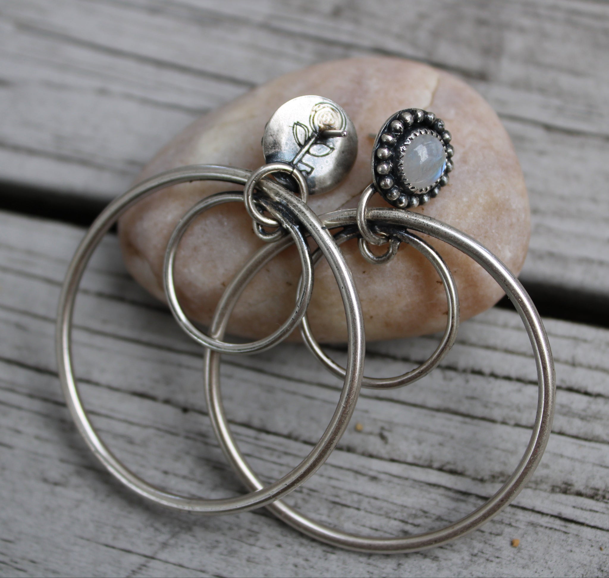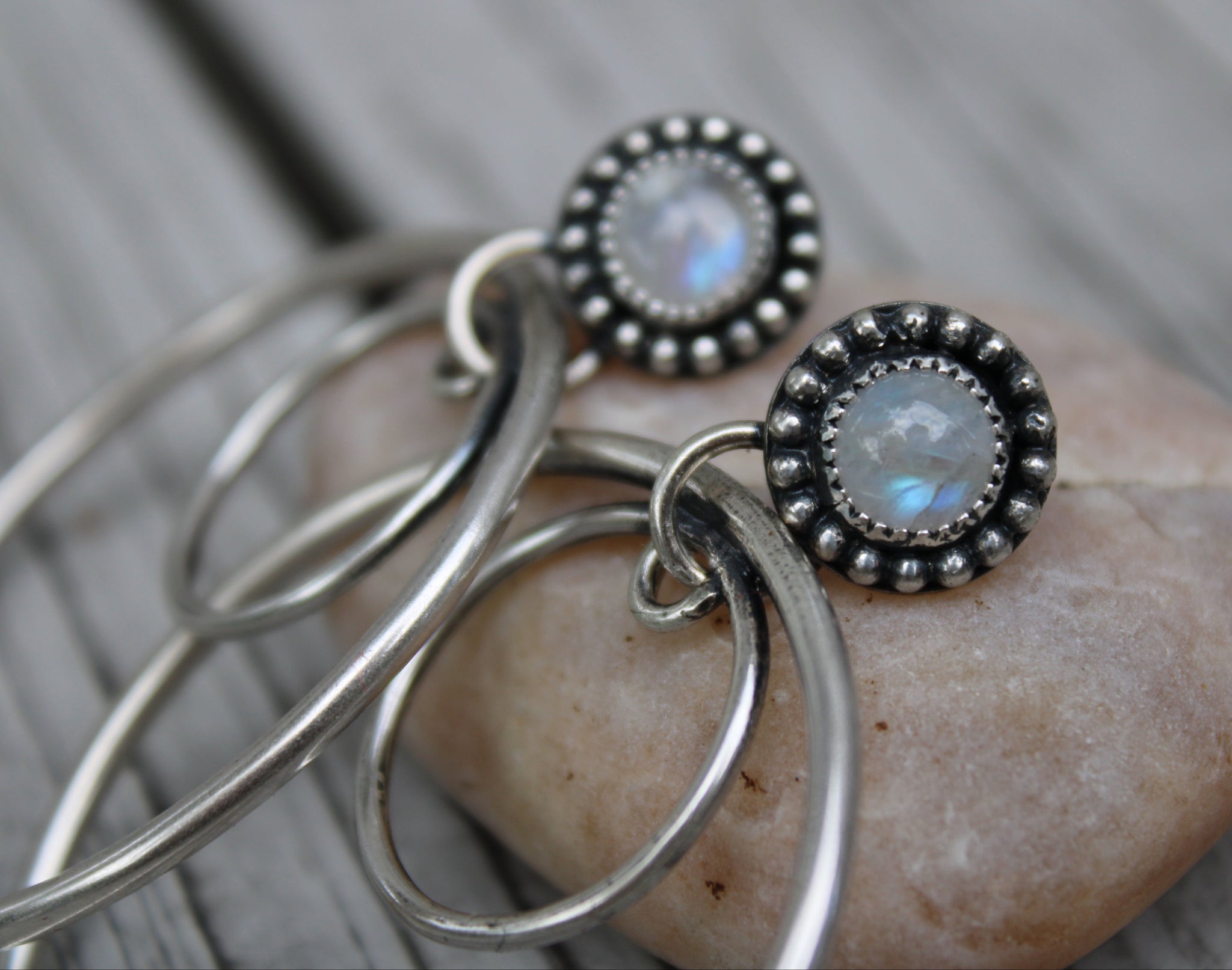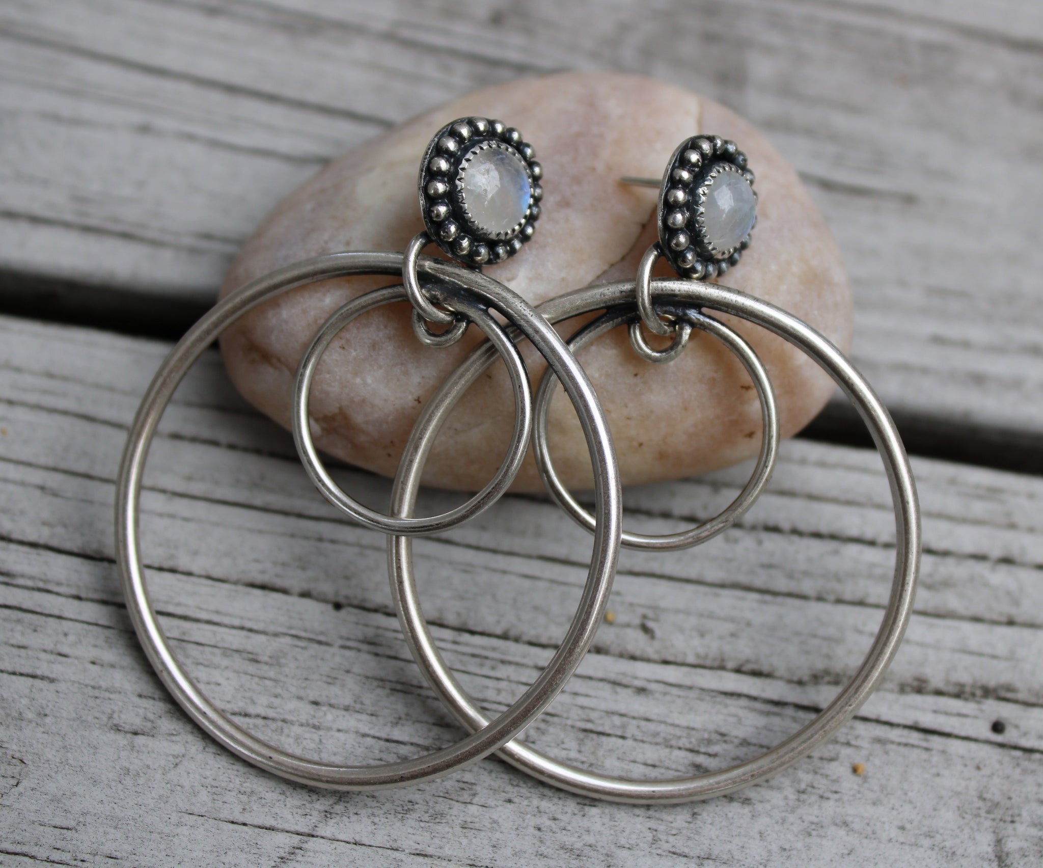 Feel the power of that inner glow with these stunning hoops! Two flashy round Moonstone cabs are the center attraction to these double hoop earrings. The stones are set in serrated bezels and framed with beaded wire. A sturdy 19 gauge stud sits on the back and below hangs a sturdy double hoop measuring 2" across. These babies make a big statement, measuring at 2 1/2" long from end to end.