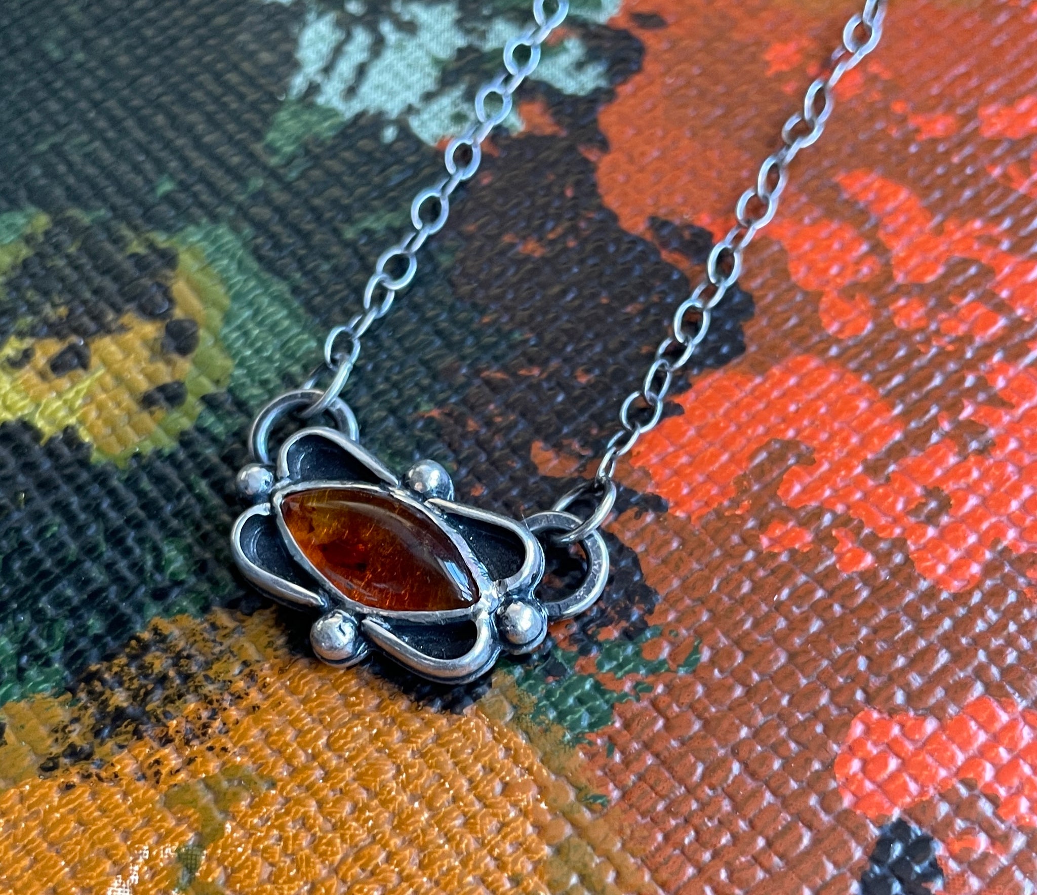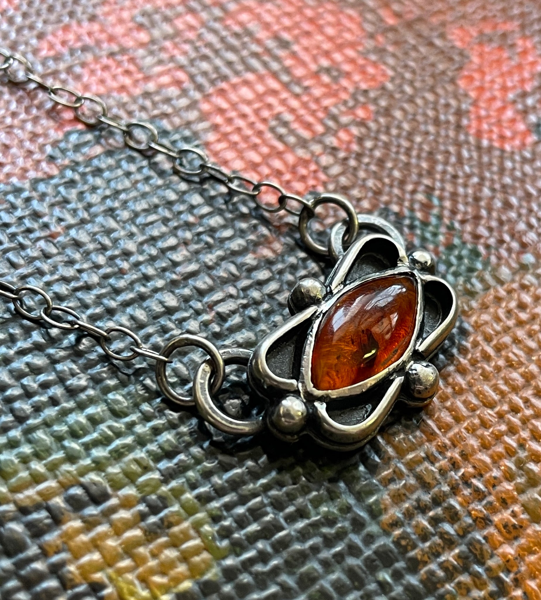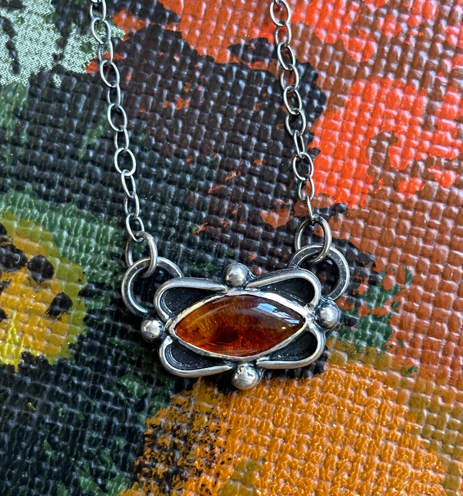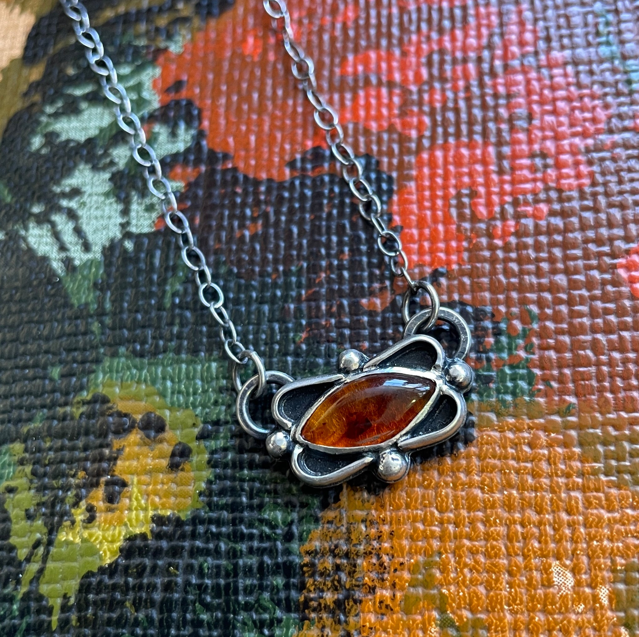 Bring that main character energy with this beauty! A marquise shaped Amber cabochon sits horizontally in this sweet, daily wear necklace. Rounded shadowbox corners create a rectangular silhouette, while silver balls finish off each meeting place. Two round wire bails allow the sterling chain to hang evenly from an 18" chain.