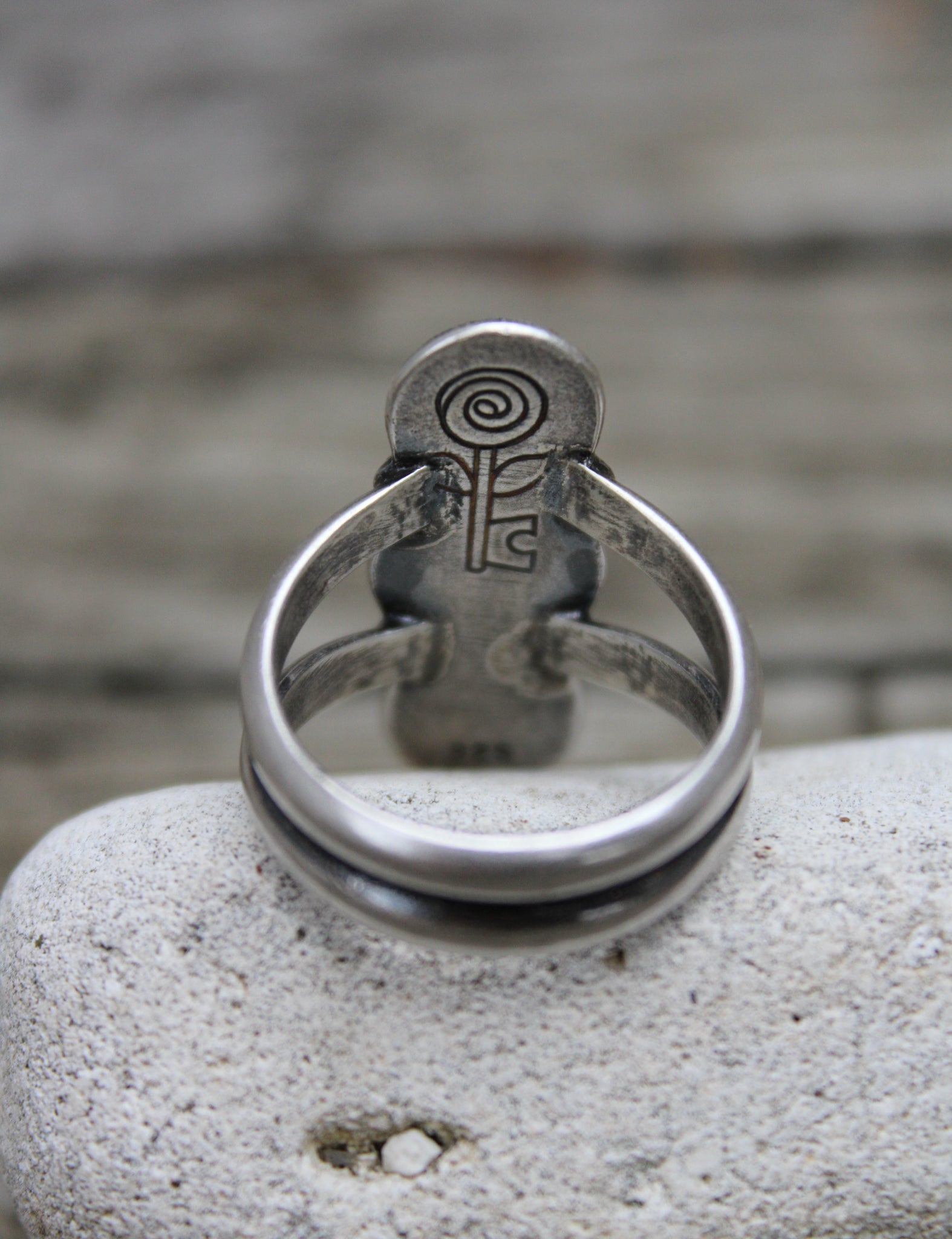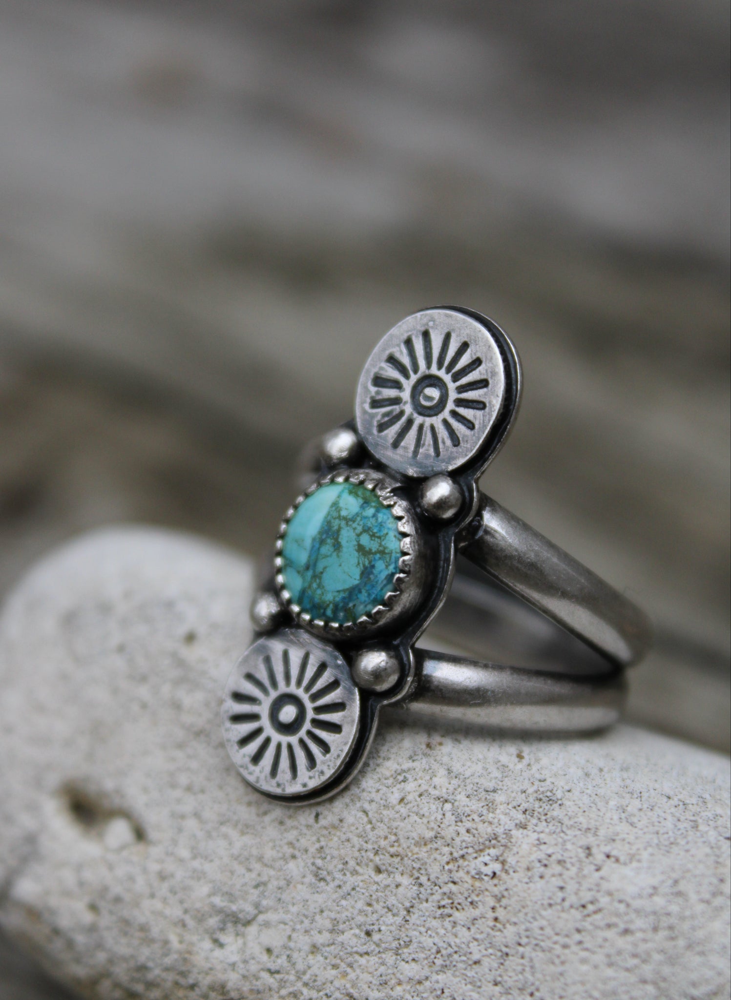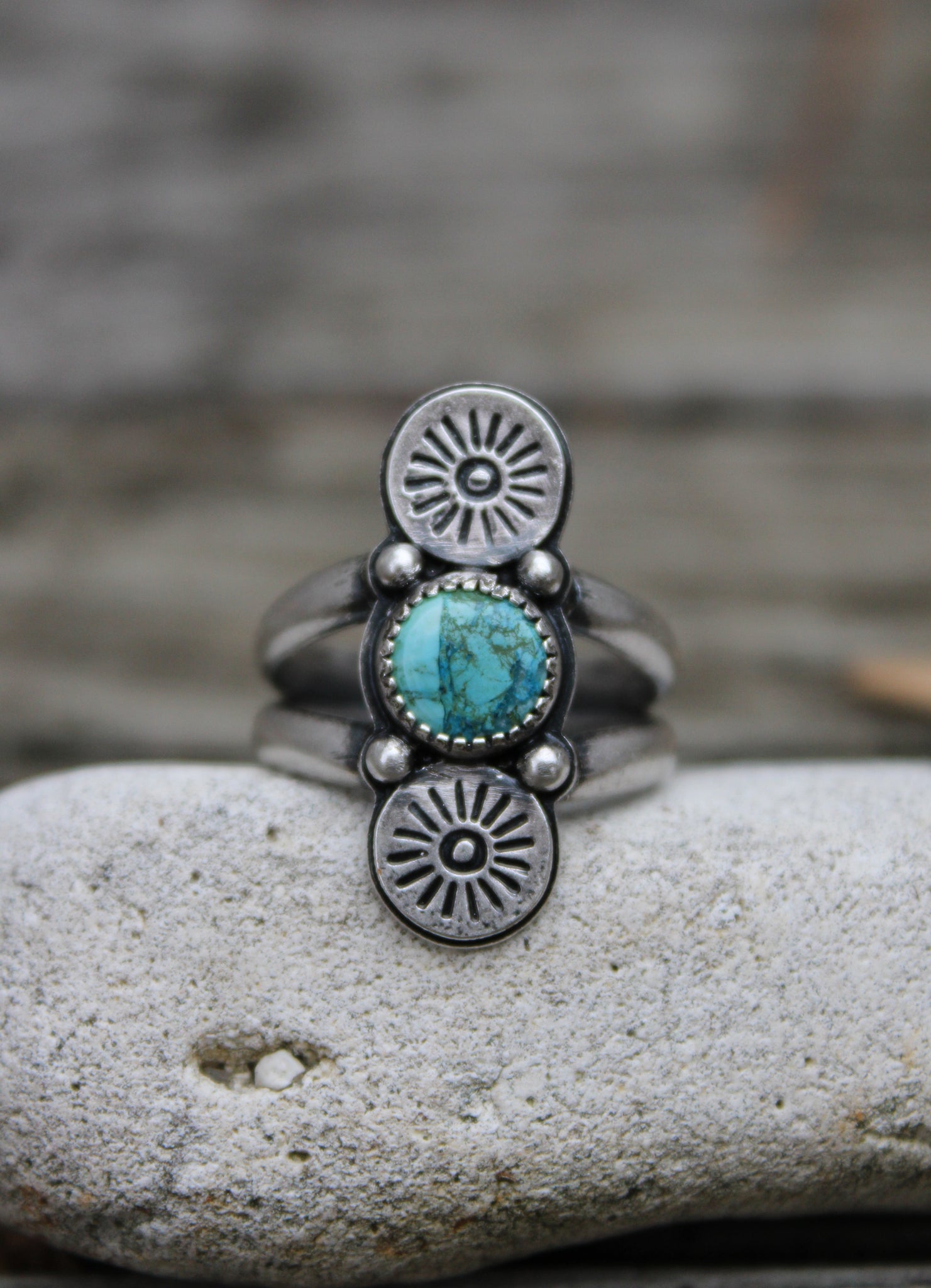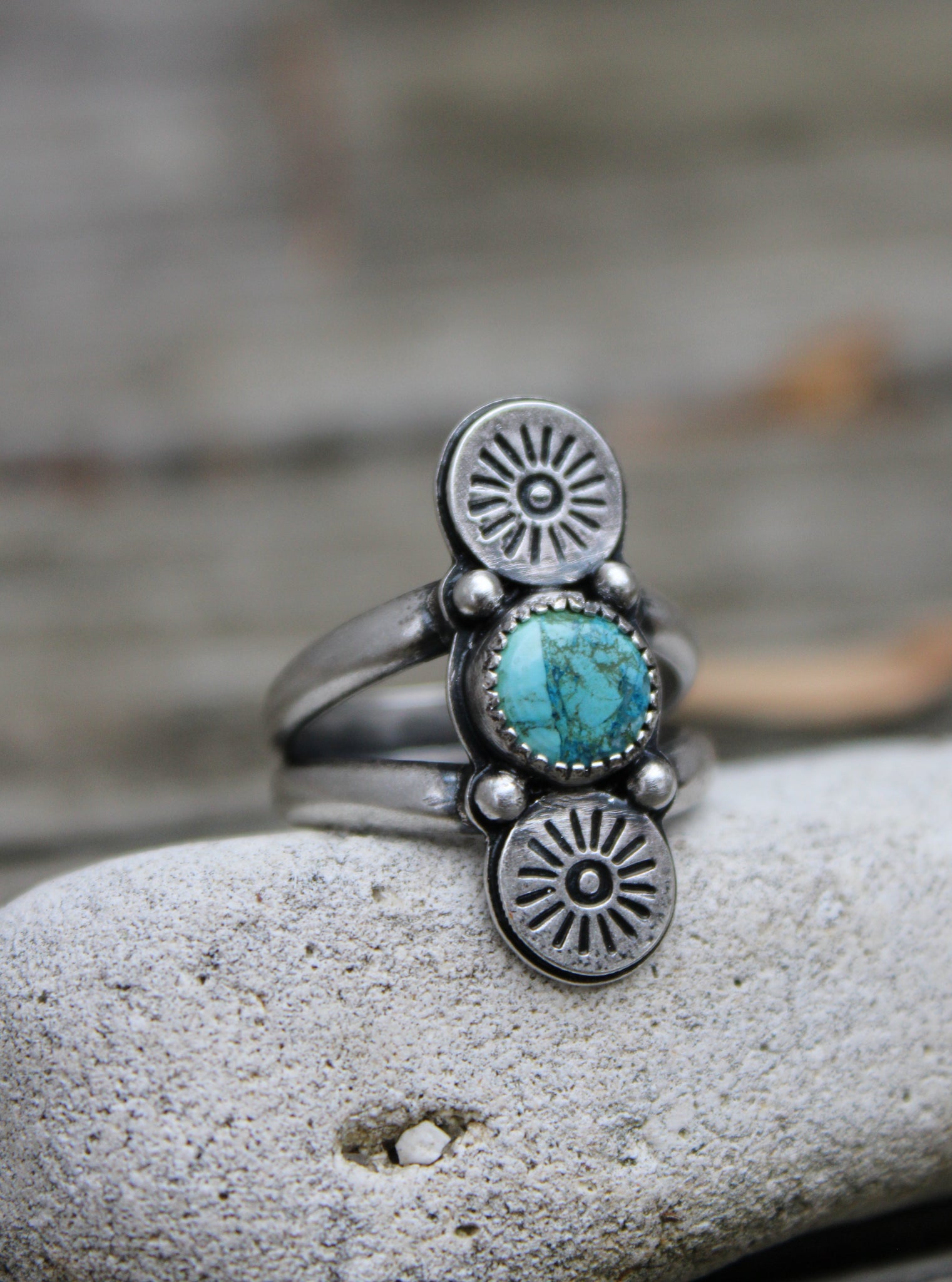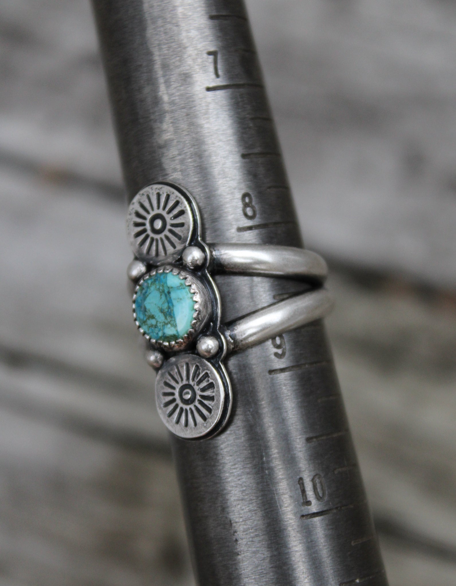 All eyes will be on you with this sweet ring! This small round turquoise has a lot to say with loads of texture and round stamped accents, all stacked up. The stone is simply set in a serrated fine silver bezel, with four silver balls at each "corner". Adorned above and below are two similarly shaped spotlight stamps. The baseplate echoes the outer shape of it all and is attached to a sturdy double split ring shank, size 8 1/2.