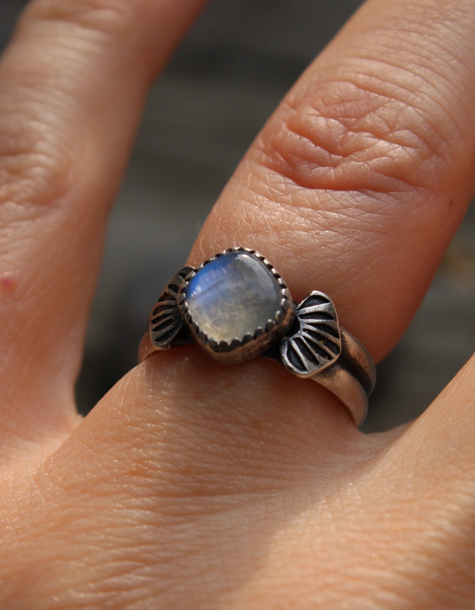Perfectly lovely rings for perfectly lovely babes! A flashy, square Moonstone cabochon is simply set in a fine silver serrated bezel, sitting point up. Each side is adorned with a curved, hand stamped detail that is securely attached to a double half round ring shank measuring at a ring size 5 1/2.
