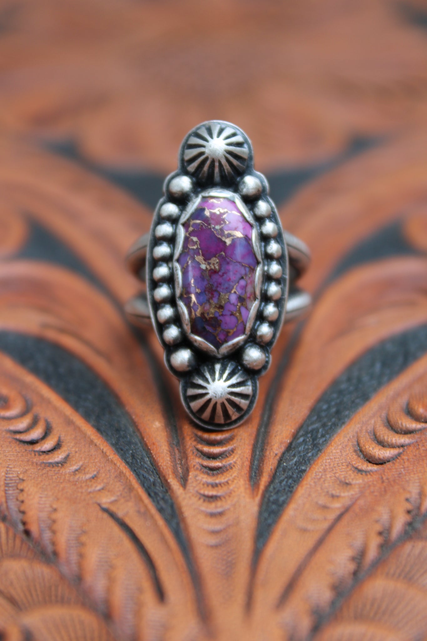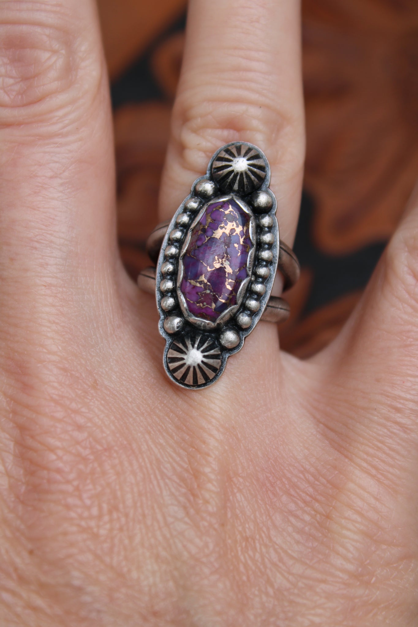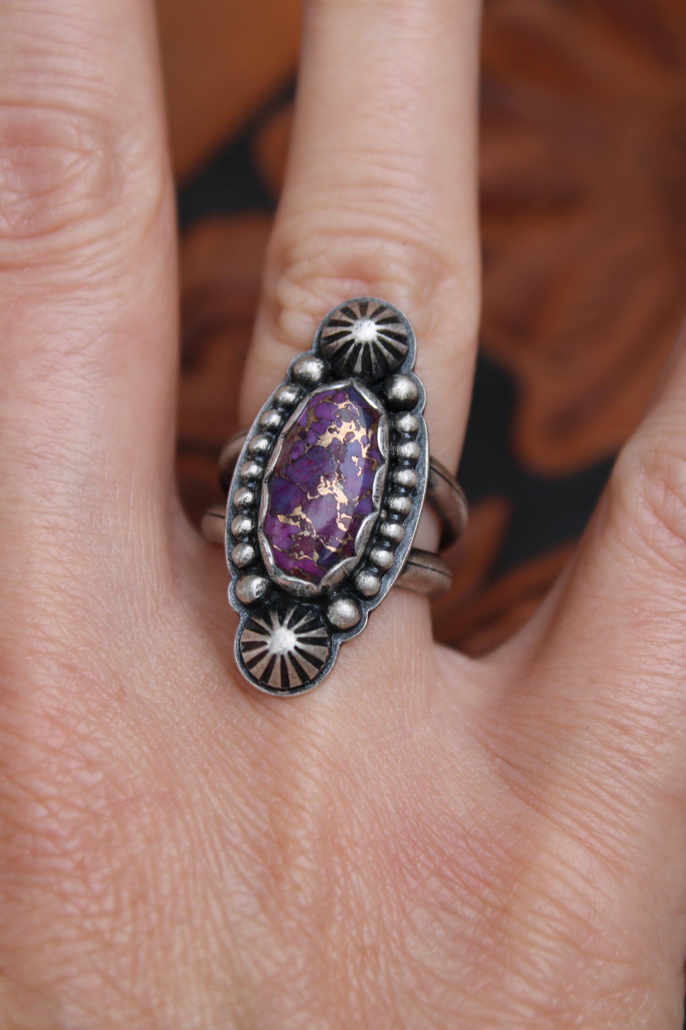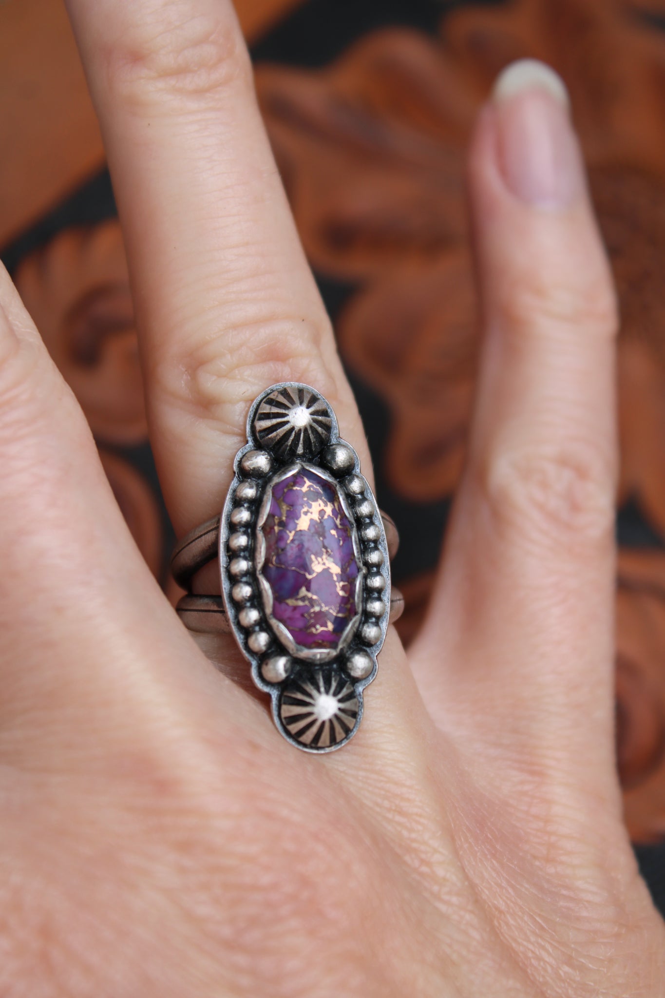 This oval turquoise ring makes a statement with it's vibrant purple stone. The oval cabochon sit vertically with a silver "star" at the top and bottom. Each side is wrapped in beaded wire and topped with a larger silver ball. The baseplate echoes the outer shape of it all and is attached to a sturdy double split ring shank, size 6. *Please note, the stone in this ring is created from actual chips of turquoise, but have been dyed, glued together and reshaped.