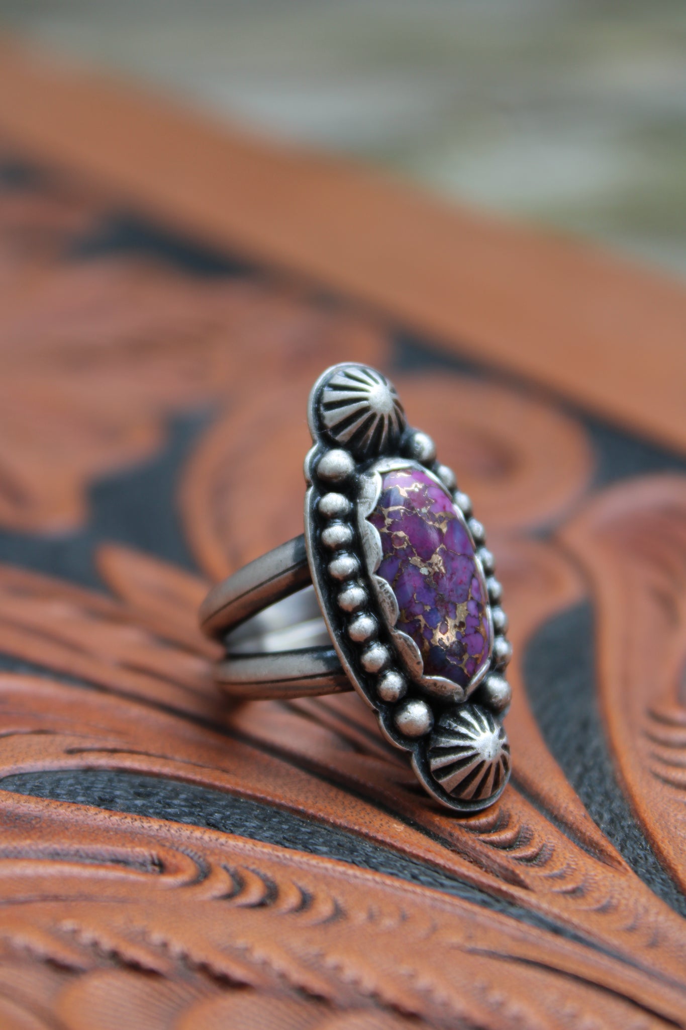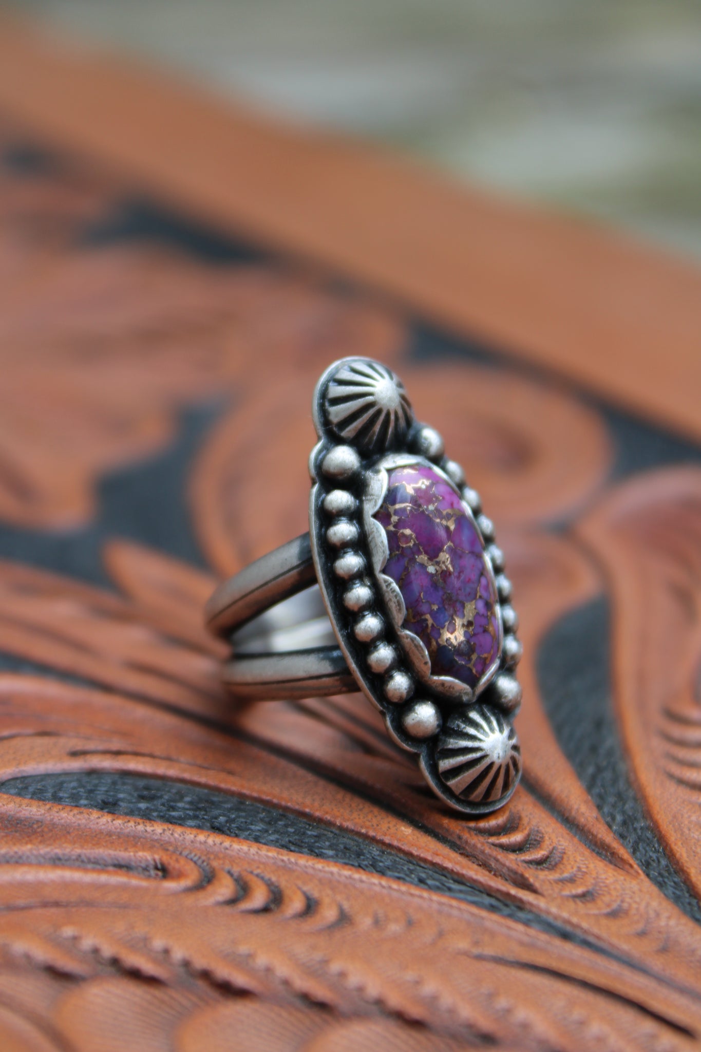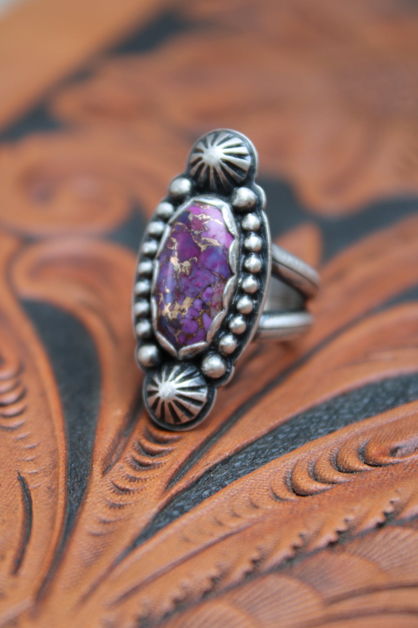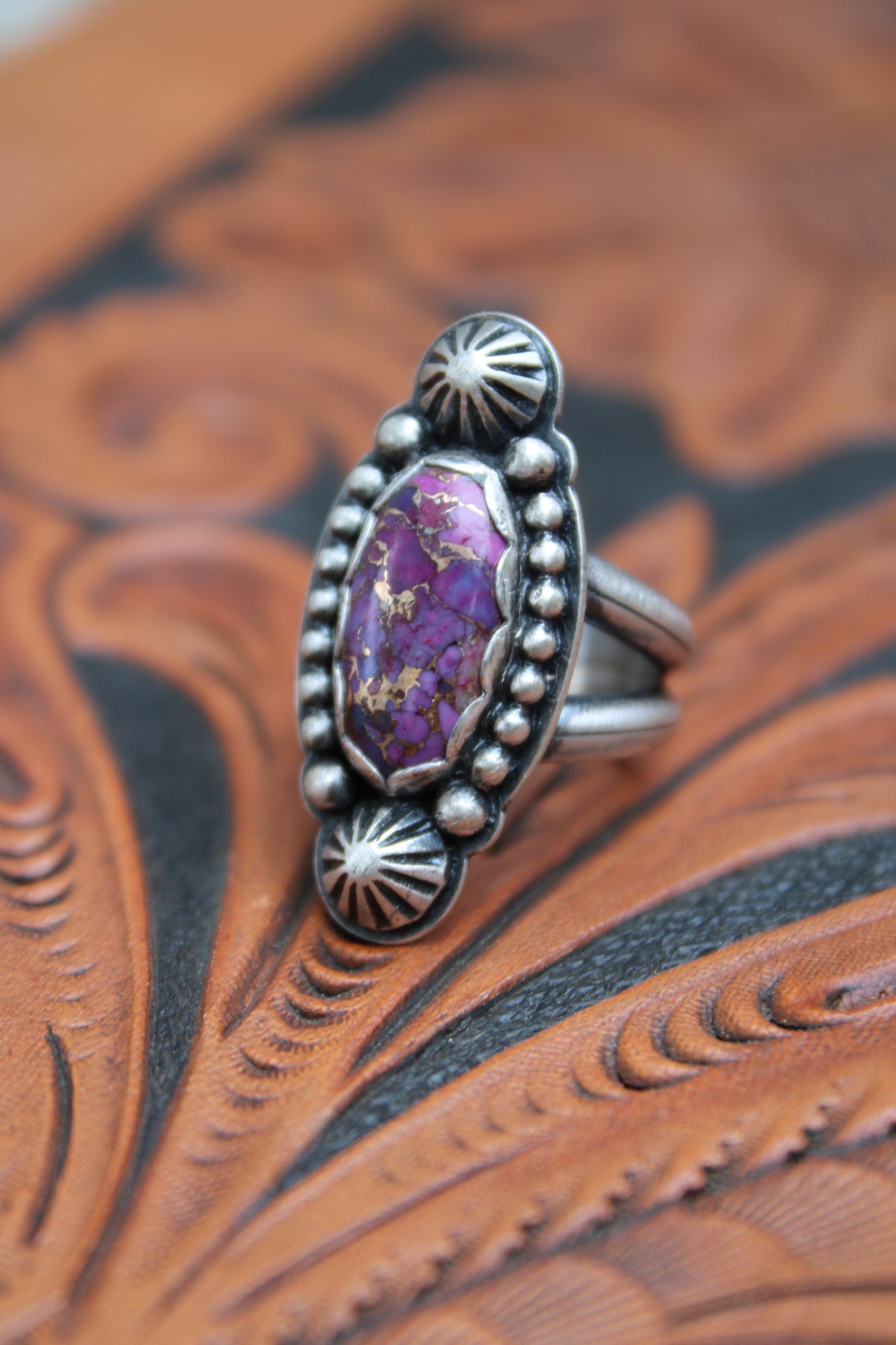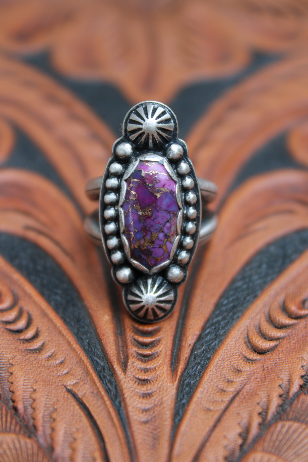 This oval turquoise ring makes a statement with it's vibrant purple stone. The oval cabochon sit vertically with a silver "star" at the top and bottom. Each side is wrapped in beaded wire and topped with a larger silver ball. The baseplate echoes the outer shape of it all and is attached to a sturdy double split ring shank, size 6. *Please note, the stone in this ring is created from actual chips of turquoise, but have been dyed, glued together and reshaped.