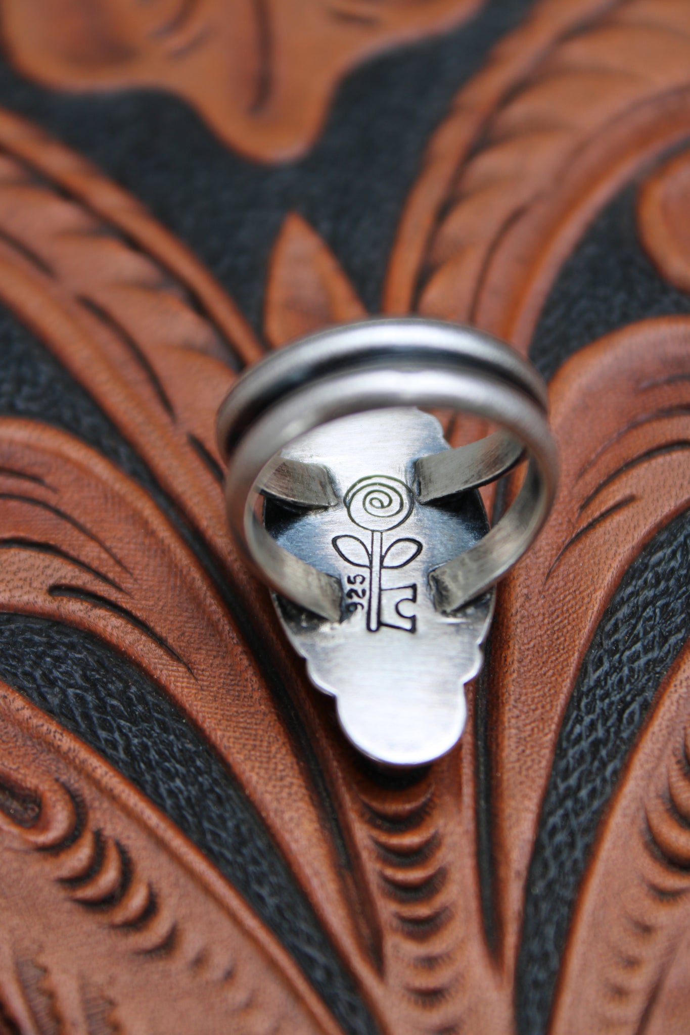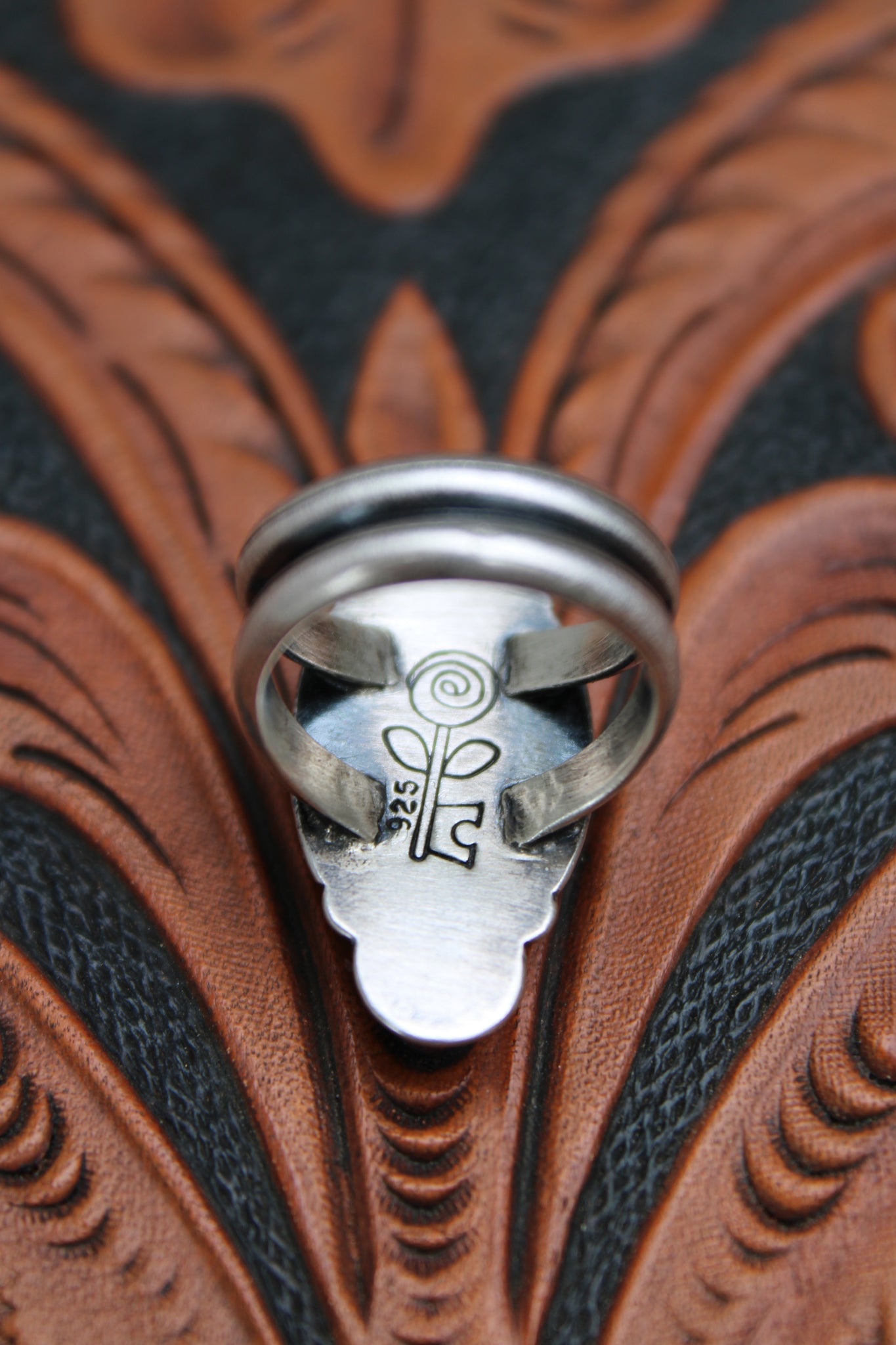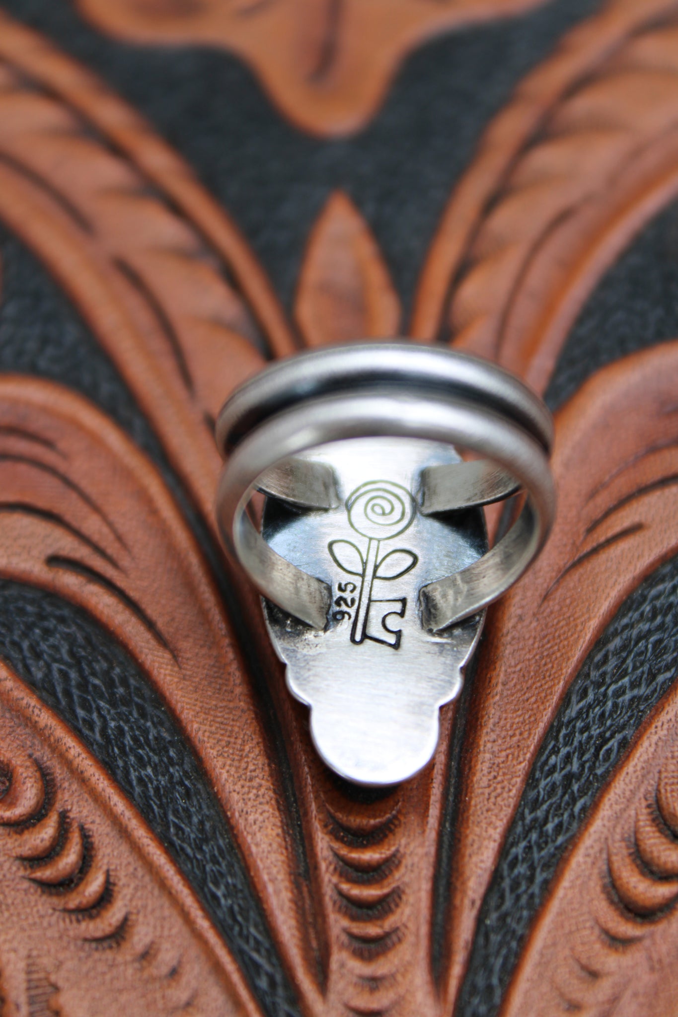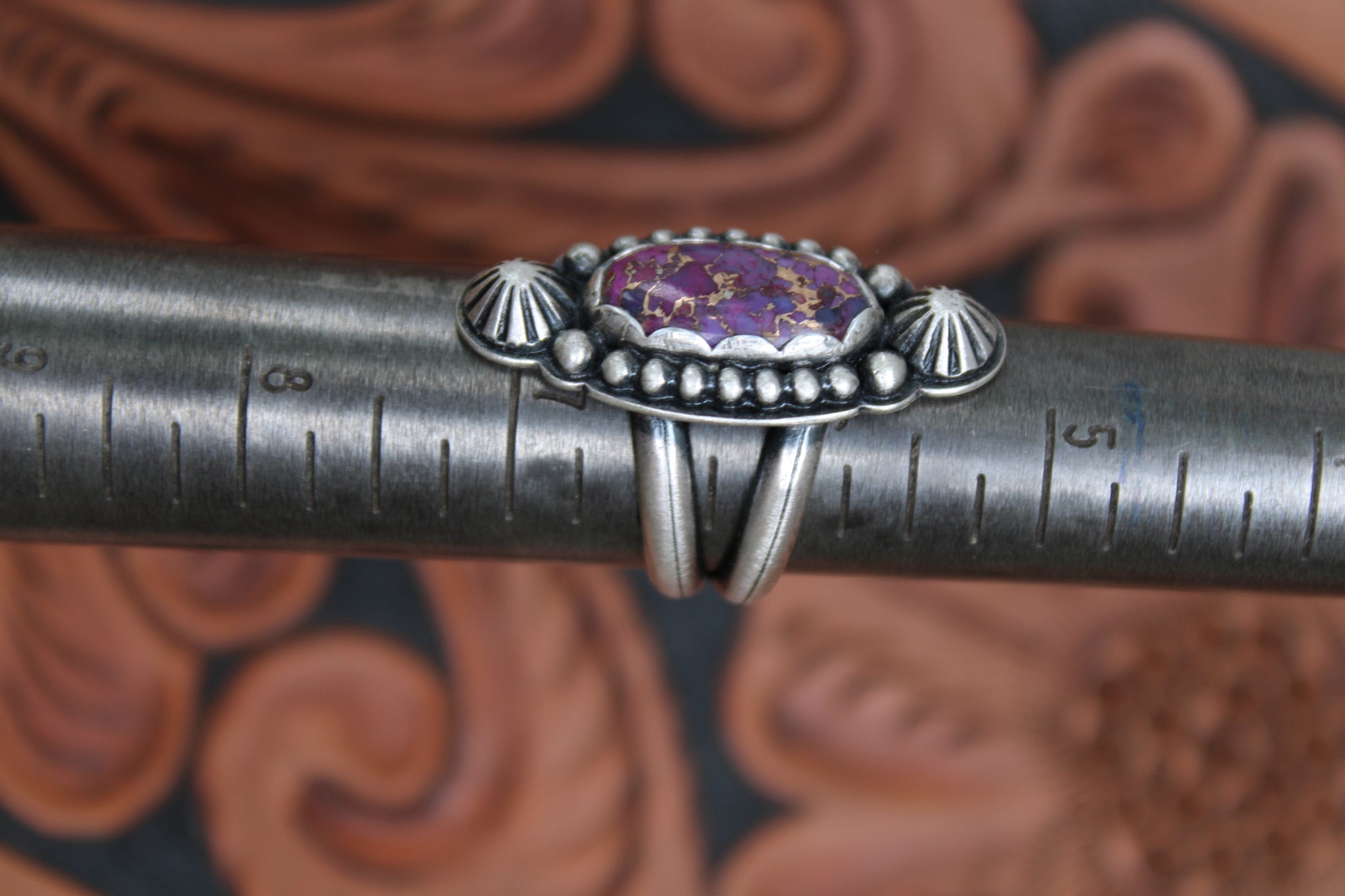 This oval turquoise ring makes a statement with it's vibrant purple stone. The oval cabochon sit vertically with a silver "star" at the top and bottom. Each side is wrapped in beaded wire and topped with a larger silver ball. The baseplate echoes the outer shape of it all and is attached to a sturdy double split ring shank, size 6. *Please note, the stone in this ring is created from actual chips of turquoise, but have been dyed, glued together and reshaped.